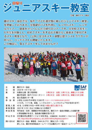 ジュニアスキー教室(日帰りバスツアー) 定員48名(最小催行人数35名) (対象:藤沢市在住 or 協会内家族 小学3年~中学生) ポスター ⇒ 詳細 ⇒ ■申し込み方法 ネット申し込みになります。 京王観光株式会社「日帰りジュニアスキー教室」申込みページ 申込みページ ![]() ■ 集合場所 ①藤沢駅 市役所地下バスロータリー ②秋葉台文化体育館(第二駐車場) 注意:第二駐車場は、2時間まで無料との事 長時間の駐車は、有料になるのでご注意下さい。 ■ 参加のしおり(表裏2枚あります) レポートに写真をアップしました。 ◆ 新しい試みですが。。 Facebookで 『藤沢スキー協会saf』のコミュニティを使い、 ジュニアスキー教室の写真を アップしたいと考えております。 (親御さんが自宅から滑っている様子が見れる) 全部は無理ですが、少しでもアップします。 https://www.facebook.com/藤沢スキー協会saf-688595161258873/ |